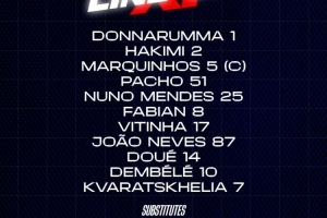 巴黎首发:1-多纳鲁马;2-阿什拉夫、5-马尔基尼奥斯、51-帕乔、25-门德斯;8-法比安、17-维蒂尼亚、87-若昂-内维斯、14-杜埃、10-登贝莱、7-克瓦拉茨赫利亚